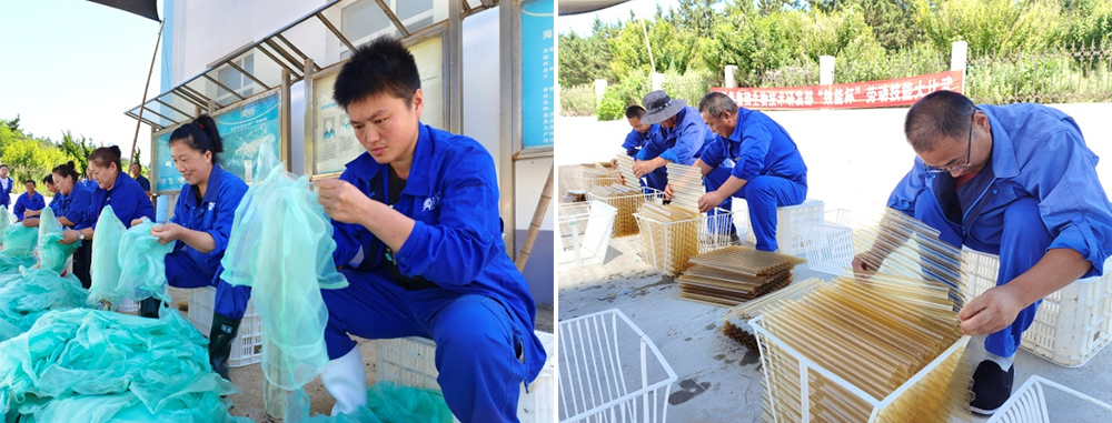 蝦夷扇貝在苗種繁育和稚貝養(yǎng)殖過程中,苗種出庫和分苗階段離不開大量的網(wǎng)袋。把單個網(wǎng)袋一層層套在一起,20個為一組的套網(wǎng)袋比賽,看似簡單重復(fù),卻是手速和專注力的比拼。只有套的快、查的準(zhǔn),一絲不茍,張弛有度,套出來的網(wǎng)袋才能為幼苗提供更優(yōu)良的養(yǎng)殖環(huán)境。