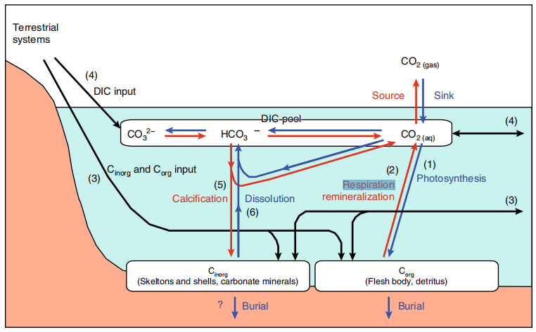 圖1 空氣-水-CO2交互的碳生物地球化學(xué)過程概念圖。藍(lán)線表示大氣CO2吸收的過程,紅線表示CO2排放到大氣中的過程。地表水中的CO2濃度主要決定通量的方向。地表水CO2濃度由溶解無機(jī)碳(DIC)中的碳酸鹽平衡決定,并受生態(tài)系統(tǒng)凈生產(chǎn)(光合作用、呼吸和再礦化的平衡)影響,直接調(diào)節(jié)DIC、外來顆粒物和溶解有機(jī)碳(Corg)、顆粒無機(jī)碳(Cinorg)以及來自陸地系統(tǒng)和沿海海洋的DIC輸入、凈Cinorg生產(chǎn)(鈣化和溶解的平衡),直接調(diào)節(jié) DIC 和總堿度(TA)和溫度(CO2溶解度)。鈣化作用產(chǎn)生的 CO2在正常海水中的比例(釋放的CO2/沉淀的 Cinorg)約為 0.6 。