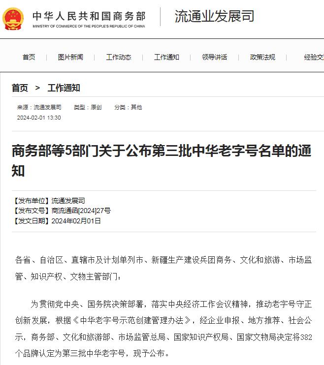 為貫徹黨中央、國(guó)務(wù)院決策部署,落實(shí)中央經(jīng)濟(jì)工作會(huì)議精神,推動(dòng)老字號(hào)守正創(chuàng)新發(fā)展,根據(jù)《中華老字號(hào)示范創(chuàng)建管理辦法》,經(jīng)企業(yè)申報(bào)、地方推薦、社會(huì)公示,商務(wù)部、文化和旅游部、市場(chǎng)監(jiān)管總局、國(guó)家知識(shí)產(chǎn)權(quán)局、國(guó)家文物局決定將382個(gè)品牌認(rèn)定為第三批中華老字號(hào)。