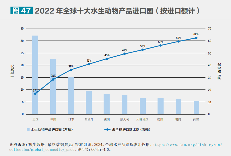 2022 年全球十大水生動物產(chǎn)品進(jìn)口國(按進(jìn)口額計)。?糧農(nóng)組織