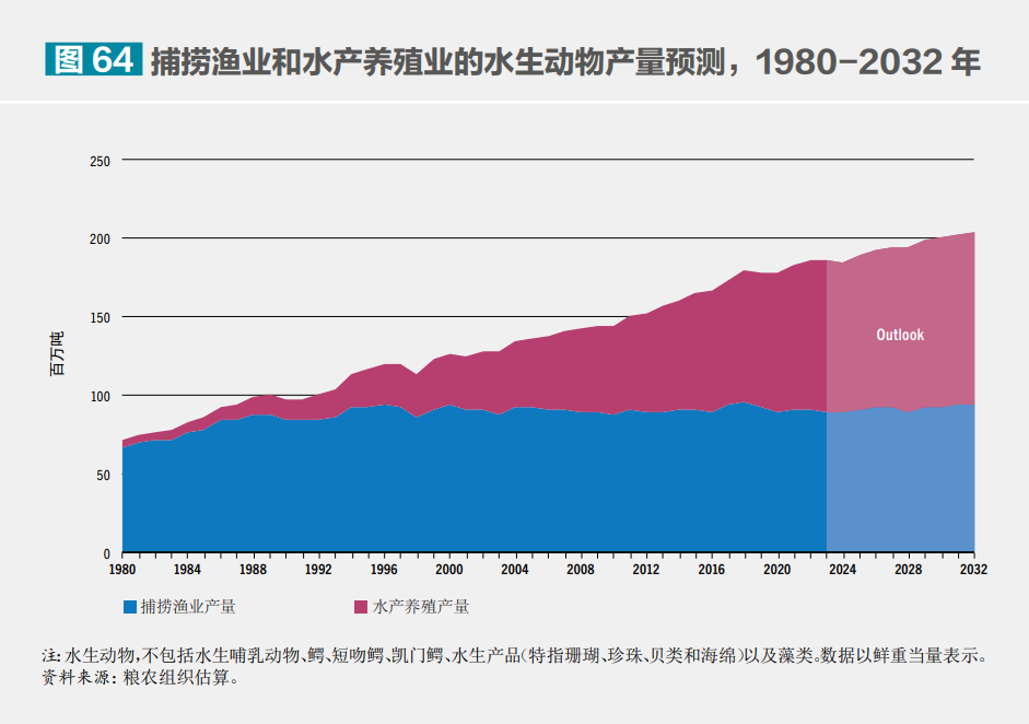 捕撈漁業(yè)和水產(chǎn)養(yǎng)殖業(yè)的水生動物產(chǎn)量預(yù)測,1980-2032年。?糧農(nóng)組織