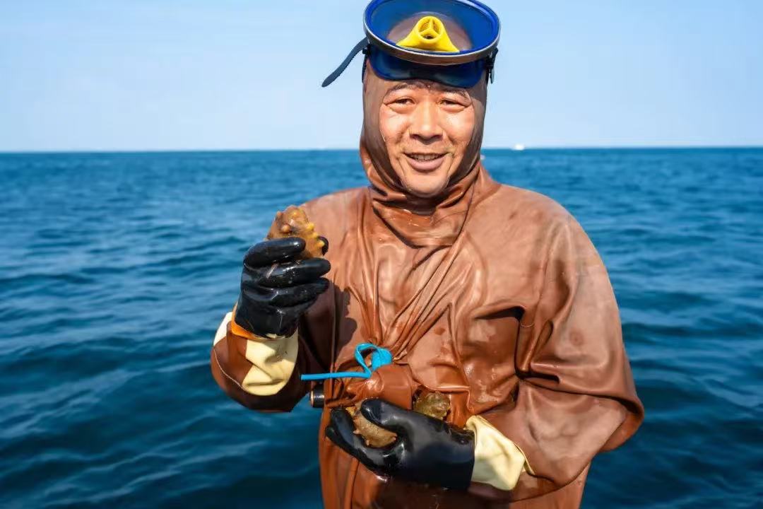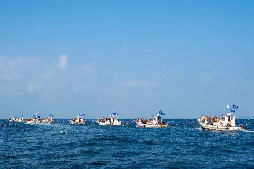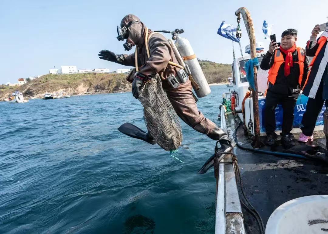 冬捕節(jié)當(dāng)天,漁民們載歌載舞唱響了冬捕節(jié)主題曲《采參謠》,傳遞著豐收的喜悅。20余名潛水員的鄭重宣誓:“感恩生態(tài),限量采捕”,表達(dá)了獐子島人對(duì)海洋始終懷有敬畏之心、感恩之情。伴著剛勁渾厚、鏗鏘有力的長(zhǎng)海號(hào)子,全副武裝的潛水員們分乘30余艘漁船劈波斬浪、乘風(fēng)出海,直奔當(dāng)日源刺參采捕地——獐子島馬牙灘海域。