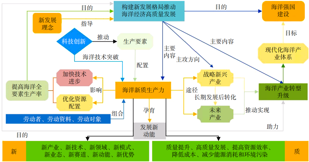 海洋經(jīng)濟作為國民經(jīng)濟的重要組成部分,其發(fā)展不僅為國家的經(jīng)濟增長注入新動力,更為推動海洋科技創(chuàng)新、提升海洋產(chǎn)業(yè)競爭力提供廣闊空間。建設(shè)海洋強國,是以習近平同志為核心的黨中央基于國家發(fā)展大局的時代要求,也是中國特色社會主義事業(yè)的關(guān)鍵環(huán)節(jié)。基于此,我們在深入學習新質(zhì)生產(chǎn)力權(quán)威解釋內(nèi)涵的基礎(chǔ)上,結(jié)合海洋經(jīng)濟發(fā)展現(xiàn)狀,進一步解讀海洋新質(zhì)生產(chǎn)力的概念及內(nèi)涵,初步提出海洋新質(zhì)生產(chǎn)力的理論框架,并探索發(fā)展海洋新質(zhì)生產(chǎn)力的實施路徑,以期為進一步踐行海洋強國戰(zhàn)略,促進海洋經(jīng)濟高質(zhì)量發(fā)展提供理論價值與實踐參考。