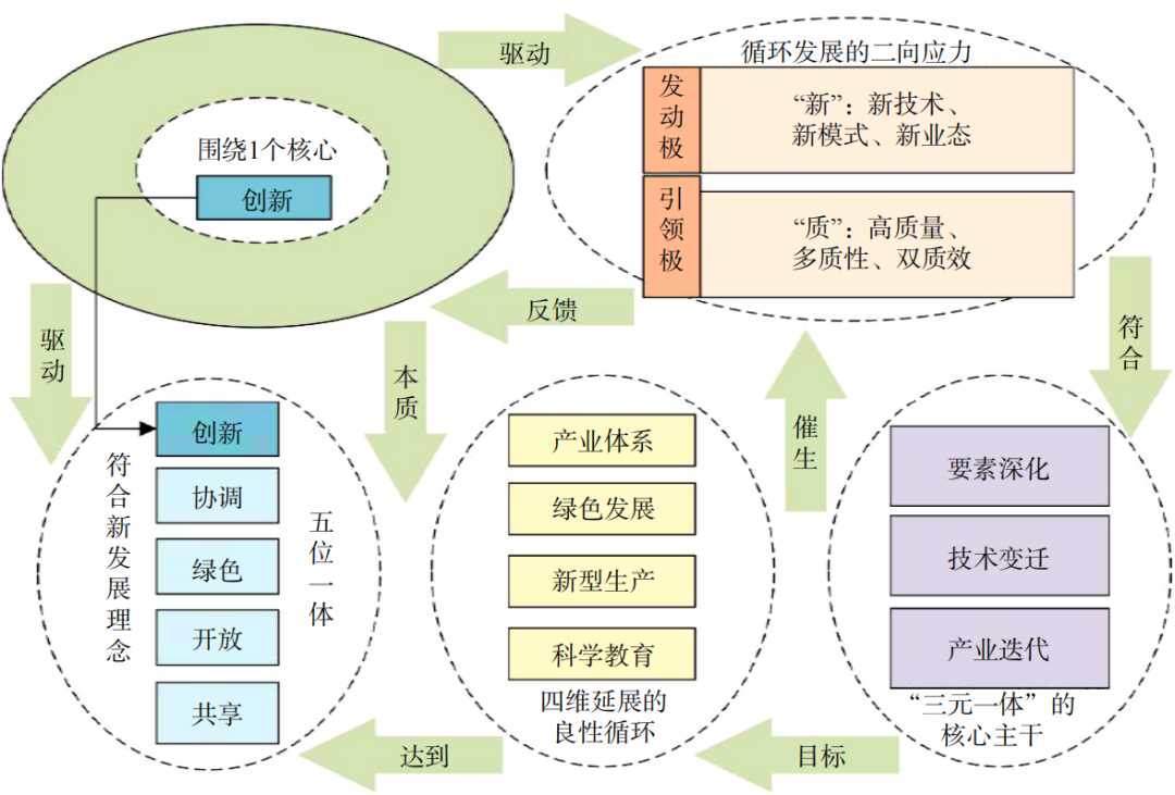 由技術(shù)革命性突破、生產(chǎn)要素創(chuàng)新性配置、產(chǎn)業(yè)深度轉(zhuǎn)型升級而催生,以勞動者、勞動資料、勞動對象及其優(yōu)化組合的躍升為基本內(nèi)涵,以全要素生產(chǎn)率大幅提升為核心標志,特點是創(chuàng)新,關(guān)鍵在質(zhì)優(yōu),本質(zhì)是先進生產(chǎn)力(圖1)。