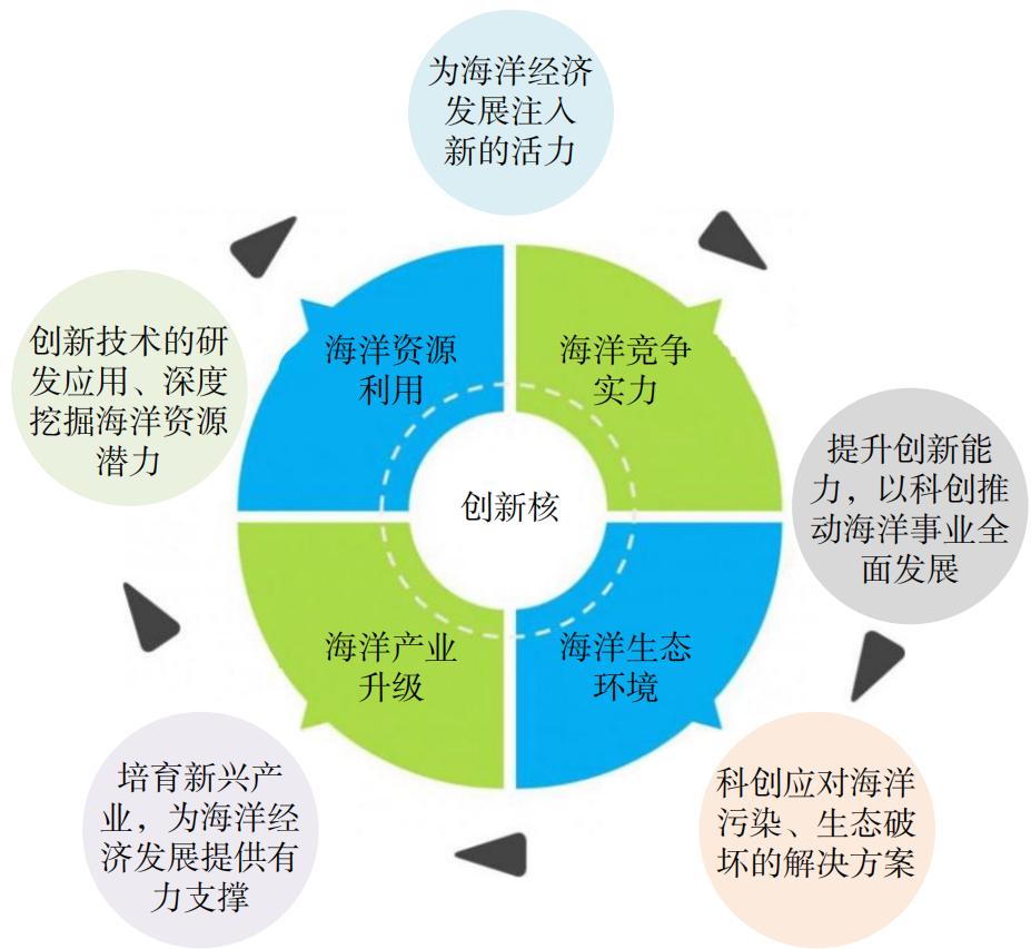 海洋科技創(chuàng)新是推動海洋新質(zhì)生產(chǎn)力發(fā)展的強大引擎,也是引領(lǐng)海洋經(jīng)濟騰飛的先導力量。海洋科技創(chuàng)新的重要性,不僅在其催生新產(chǎn)業(yè)、新模式、新動能,更在于其對于提升海洋資源利用效率、保護海洋生態(tài)環(huán)境、增強國家海洋競爭力等方面具有深遠影響(圖6)。