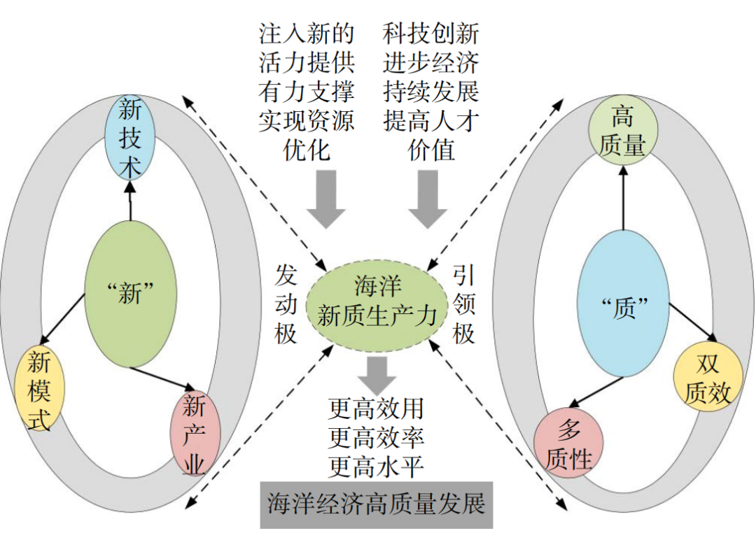 海洋新質(zhì)生產(chǎn)力,新是其發(fā)展的原動力“發(fā)動極”,不斷推動生產(chǎn)力的解放與發(fā)展,并為其注入新的活力。同時,質(zhì)是其引領(lǐng)的方向“引領(lǐng)極”,通過不斷拓展人類效用的邊界和豐富社會福利的內(nèi)涵,降低對海洋環(huán)境的壓力,實現(xiàn)海洋經(jīng)濟的可持續(xù)發(fā)展,促進生產(chǎn)力體系向更高質(zhì)量、更高效率和更高水平邁進(圖7)。