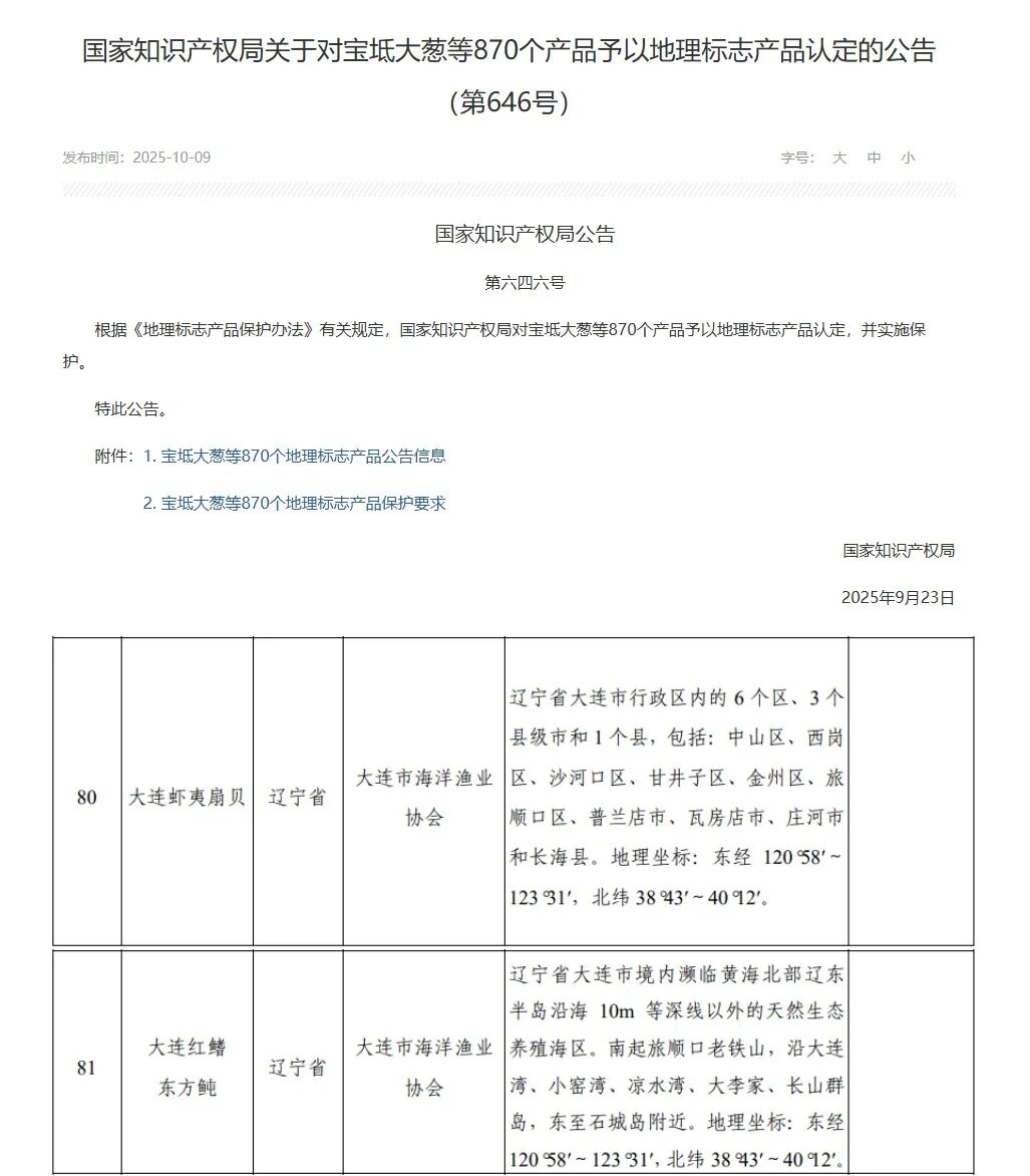 10月9日,國(guó)家知識(shí)產(chǎn)權(quán)局發(fā)布公告:依據(jù)《地理標(biāo)志產(chǎn)品保護(hù)辦法》,全國(guó)870個(gè)產(chǎn)品新晉“國(guó)家地理標(biāo)志產(chǎn)品”,其中“大連蝦夷扇貝”“大連紅鰭東方鲀”雙雙入選。這意味著,大連人引以為傲的兩大“海鮮明星”,不僅有了國(guó)家官方認(rèn)證的“身份標(biāo)識(shí)”,更將以更優(yōu)品質(zhì)、更規(guī)范的市場(chǎng)環(huán)境,端上更多家庭的餐桌。