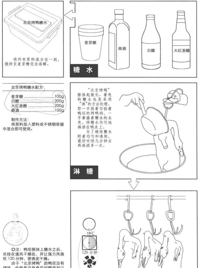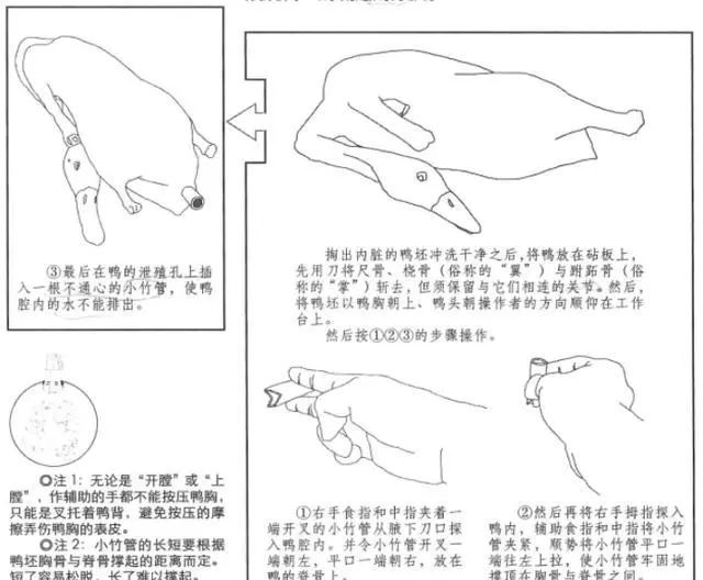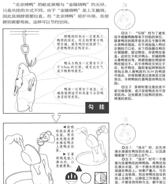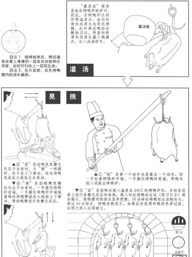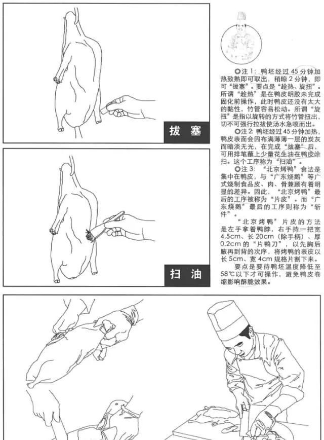 圖里的步驟,只是烤一只鴨子,還沒有到片鴨,按照肥瘦部位,一片片把脆鴨皮、鴨肉、骨架片下來的工序。