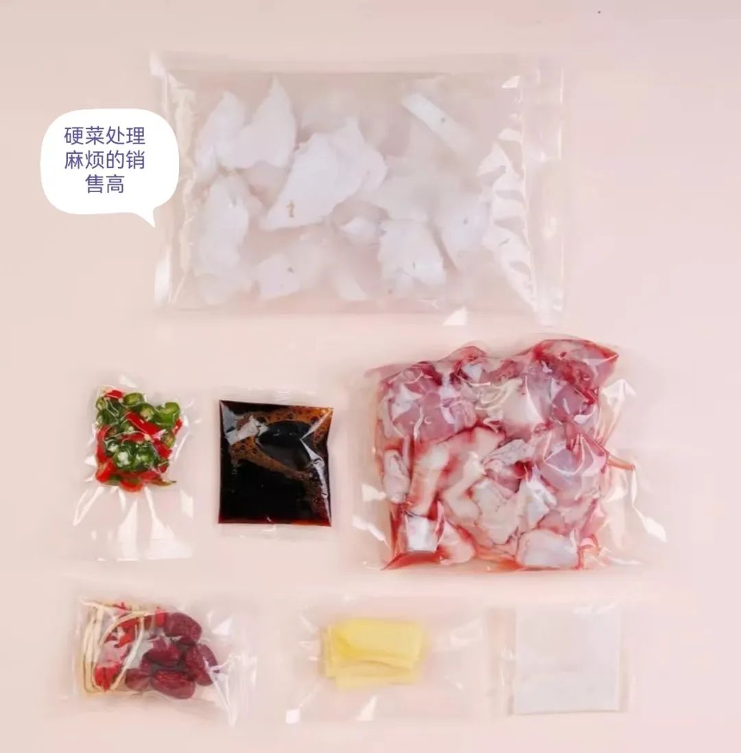 所以就有了第三類,標(biāo)上步驟,把肉菜、調(diào)料和蔬菜分開打包的類型。