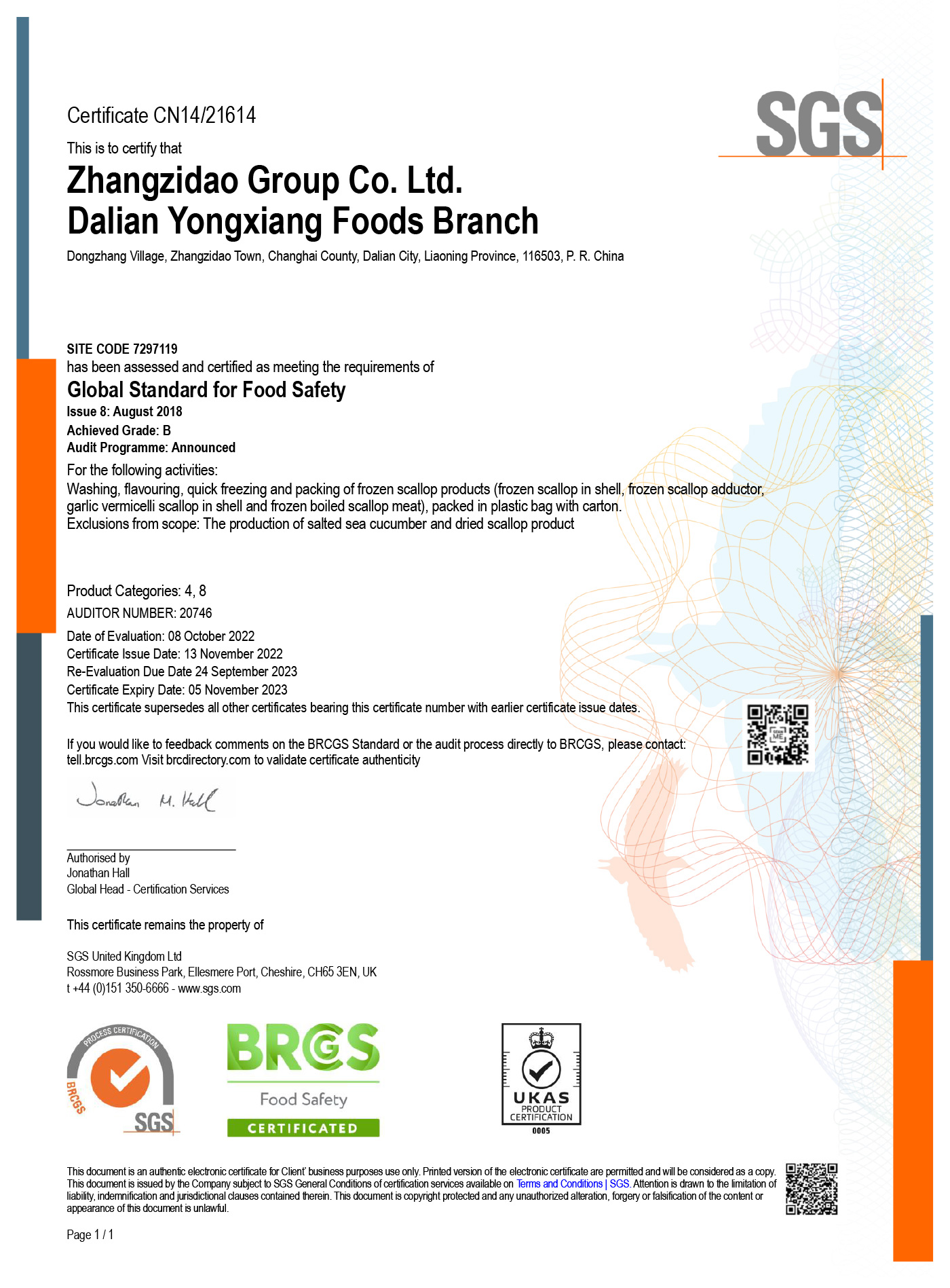 Zoneco Group Co.,LTD Dalian Yongxiang Branch located in Zhangzidao island, which is the southernmost island in Changhai County, Dalian, Liaoning. The company was founded in 1980, with a total construction area of over 223.26 million square meters. It can achieve an annual processing capacity of over 29000 tons of shellfish raw materials and a refrigeration capacity over 1500 tons. The company has obtained various certifications such as HACCP, ISO 90001, BRC, organic product certification, SGS SCM MARK, and export qualifications. It is a processing and production base of shellfish and sea cucumber.The raw materials produced by the company are all sourced from the national A-class production marine aquaculture areas. The products are mainly exported to countries and regions such as the United States, Canada, Australia, New Zealand, Japan, South Korea, Hong Kong, etc.SCALLOP