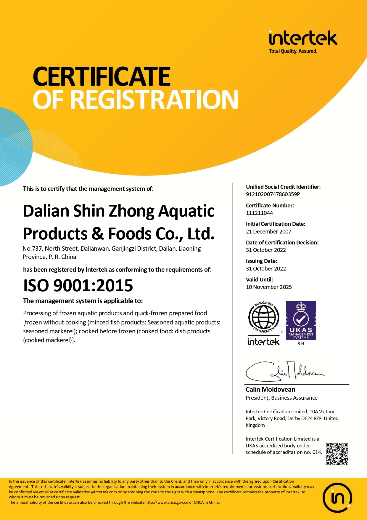 Dalian Shinzhong Aquatic Products&Foods Co., Ltd. was founded in 2003, which is specialized in seafood processing enterprises. The company covers an area of 66,000 square meters, with more than 20,000 square meters of processing area. The company has built 15,000 tons of cold storage and 100 tons of ultra-low temperature freezer.The company has an experienced processing team and a Knowledgeable professional management team. The company is obtained FDA certification and EU factory number, and also passed the ISO9000, HACCP, IFS, BRC, MSC and other quality and food safety management system certification. The company’s main processing products are mackerel, red fish, Atka mackerel, Salmon, Herring roe, cod etc. The company’s products are mainly sale in the Japanese market, supplying catering, supermarkets, convenience stores, schools, hospitals and other channels.MACKEREL